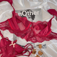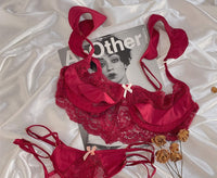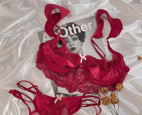 Go ahead, show off with red lace and exquisite details a low open back, and enamel heart details. Finished with a sweet decorative mini bow ties.
